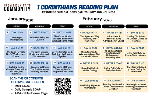 Day 10: 4:6-13 (The Apostles’ Way: Humility and Suffering)Day 11: 4:14-21 (Imitate Me: A Father’s Loving Admonition in Christ)Day 12: 5:1-13 (Loving Discipline: The Church Called to Holiness)Day 13: 6:1-11 (Disputes: God’s Wisdom in Love, Not the World’s Way)A Christian Perspective on Sexual MoralityDay 14: 6:12-20 (The Body as God’s Temple: Living in Holiness and Honoring Him)Day 15: 7:1-16 (Living Faithfully in Every Circumstance)Day 16: 7:17-24 (Living Faithfully in God’s Calling)Day 17: 7:25-40 (Living Faithfully in Every Decision)Day 18: 8:1-13 (Knowledge Guided by Love: Caring for the Weak)Day 19: 9:1-12 (Sacrificing Rights for the Gospel)Day 20: 9:19-27 (Running the Race for Christ: Discipline and Devotion)Day 21: 10:1-13 (Learning from Israel: enduring Temptation with faith)