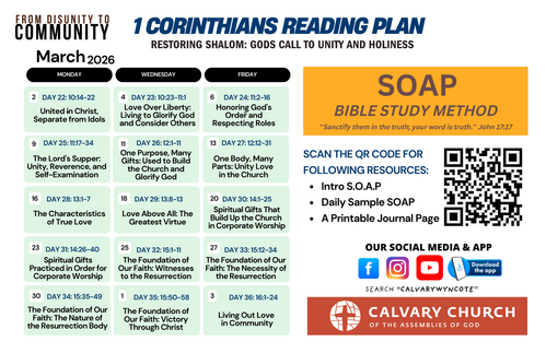 Reading Plan : 1 Corinthians Reading PlanDay 1: 1 Corinthians 1:1-9 (Greeting & Thanksgiving )Day 2: 1:10-17 (Unity in Christ, Not Division)Day 3: 1:10-17 1:18-31 (The Cross: God’s Wisdom and Power in What Seems Weak)Day 4: 2:1-9 (The Spirit Reveals God’s Wisdom and Power)Day 5: 2:10-16 (The Spirit Grants Understanding and Discernment)Day 6: 3:1-9 (Co-workers for God: Building His Church Together) Day 7: 3:10-17 (Building God’s Church: Foundation of Christ, and Holiness)Day 8: 3:18–23 (Boasting in Christ: The Foolishness of Worldly Wisdom) Day 9: 4:1-5 (Servants of Christ: Trusting God’s Judgment, Not Ours)