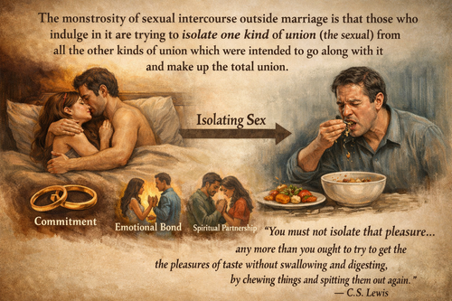 C.S. Lewis offered a perceptive warning about the danger of trying to isolate the physical act of sex from its personal bonding function. He explained it this way: “The monstrosity of sexual intercourse outside marriage is that those who indulge in it are trying to isolate one kind of union (the sexual) from all the other kinds of union which were intended to go along with it and make up the total union. The Christian attitude does not mean that there is anything wrong about sexual pleasure, any more than about the pleasure of eating. It means that you must not isolate that pleasure and try to get it by itself, any more than you ought to try to get the pleasures of taste without swallowing and digesting, by chewing things and spitting them out again.”13